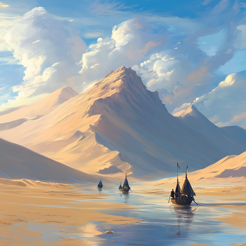 “Brace!” a low voice called from high on the stern. But as swift as it appeared, the word was ripped away by strong gales – another grain of sand on the glassy winds. And as he called, the ship reared, the prow raising high into the air until all beyond was blue sky. For a moment it seemed to hang there motionless. But down it came with a resounding crack, the ship’s hull slamming into the desert, throwing waves of sand high over the front deck. The crew ducked away, holding their wrapped scarves firmly over their faces, as streams of sand bounced from wide goggles. The boat slid down the dune on its glass hull, its twin keels carving lines like skates through ice.